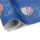 A colorful aerostatic hot air balloon seen from below sits against a deep blue, starry background. The design is vibrant with red, white, and blue segments, surrounded by scattered small yellow and white accents.