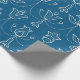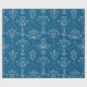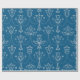 Unrolled and flat sections of blue wrapping paper with white floral patterns. The elegant design conveys a sophisticated and classic tone.
