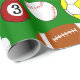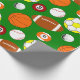 Este papel de embrulho tem um design de novidade de diferentes bolas esportivas, incluindo bolas de basquete, bolas de beisebol, bolas de bilhar, bolas de futebol, bolas de futebol e bolas de golfe.