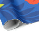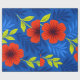 The design features a repeating floral pattern composed of large, stylized flowers with smooth, rounded petals. The flowers are colored in a vivid vermilion red, giving them a warm and energetic appearance. Each flower has a dark red center that adds depth and visual intensity. Surrounding the flowers are elegant leaves in bright green and olive green tones, created with clean and simple shapes. Additional leaf elements in different blue shades enrich the design and blend naturally with the composition. The background is a deep blue color that enhances the contrast and highlights the floral elements. The overall style is flat, decorative, and modern, with bold colors and clear shapes.