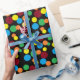 Este é um papel de embrulho bonito, divertido e 'feliz' com um padrão colorido de bolinhas a preto! Vai fazer todos os seus presentes maravilhosos se destacarem debaixo da árvore de Natal!
