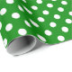 Um papel de embrulho construído com um padrão de bolinhas branca com uma distância média entre os pontos sobre um fundo verde. Personalize o plano de fundo verde entre outras opções.