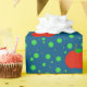Fundo azul com bolinhas verdes e maçãs vermelhas com um verme verde saindo delas. Este presente é uma ideia para um presente de professor.