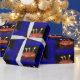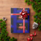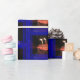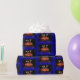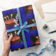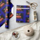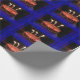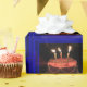 Uma foto de um Bolo de Aniversário junto com um quadro azul com Velas queimando com chamas. Isso é brilhante e colorido. Isso foi em Sterling Kansas USA. Está no WRAPPING PAPER.