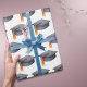 Papel de embrulho de festa de formatura simples e bonito com um padrão de bonés de formatura pretos com uma fita de ouro. Excelente para embrulhar presentes de graduação! Ilustrada e projetada por Patricia Alvarez.