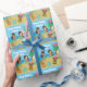 Bonitas dançarinas hula personalizadas em uma praia para sua festa de luau. Personalize esta bonito ilha tropical embrulhando papel para uma celebração à beira-mar na areia. Apresenta uma palmeira legal e dança perto das estátuas de Tiki e da água azul.