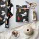 Este design de feriado apresenta unicórnios na moda com lenços vermelhos entre flocos de neve e árvores festivas de Natal em vermelho e ouro sobre fundo preto.