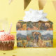 Celebre a beleza do outono com esta pintura vibrante de um cão sentado ao lado de uma bela colheita de Ação de Graças. As ricas cores do outono de abóboras, girassóis e paisagem rural rústica criam uma atmosfera quente e convidativa, perfeita para a decoração sazonal de qualquer amante de cachorro.
