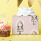 Bonita figura de palito com véu, cabelos loiros, vestidos de rendas e saltos altos em um fundo cor-de-rosa. A cor de fundo pode ser alterada.