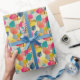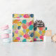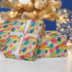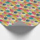 A dynamic leaf pattern featuring overlapping leaves in pink, orange, yellow, blue, and green, intersected by thin black branches. A colorful, eye-catching design perfect for statement autumn gift wrap or vibrant packaging.