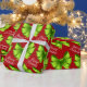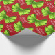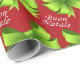 Buon Natale embrulhando papel com grandes arcos verdes sobre fundo vermelho e a mensagem Buon Natale em branco.