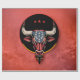 Cabeça de touro Patriótica, um touro Americano. Uma cabeça de touro estilizada que parece poderosa e dinâmica. O touro é predominantemente vermelho vibrante, simbolizando força e energia. Seus chifres são brancos, criando um contraste impressionante e chamando a atenção para a cabeça. O rosto do touro é escuro e barba, com sotaques amarelos que realçam detalhes e adicionam profundidade à imagem. Na testa do touro está um padrão de bandeira americana, enfatizando filiação nacional. Esse padrão é representado em detalhes do excelente e dá ao design um toque patriótico.