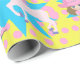 Pequena vaquinha de cabelo castanho e impressão cor-de-rosa com papel de embrulho de presente de bolinhas rosa e amarelo.