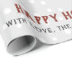 Cachorro de inverno, árvores e casa Feliz feriado Papel de Molho de Natal que mostra um cachorro em roupas de inverno, árvores, uma casa, ornamentos e presentes.