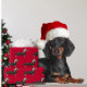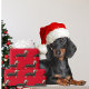 Um cão Dachshund em um Pai Natal... enrolando design de presente de Natal. Brilhe sua temporada de férias com nosso papel festivo de embrulho de cachorro apresentando um adorável Dachshund vestido com um chapéu de Santa. Este design alegre adiciona um toque divertido aos presentes de Natal.