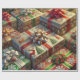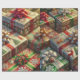 A cena retrata um arranjo de caixas de presentes de Natal embrulhadas em papel festivo e atordoante. O papel de embrulho apresenta designs intrincados como flocos de neve, folhas ocas, canas doces e árvores de Natal, rendidos em cores vibrantes como vermelho, verde, ouro e branco. Cada caixa brilha com um acabamento brilhante ou metálico, refletindo luz suave e quente para melhorar seu apelo festivo. Os presentes são amarrados elegantemente com fitas luxuosas e arcos que combinam ou complementam o papel de embrulho. O fundo sugere uma atmosfera de férias acolhedora, com luzes cintilantes quentes, uma árvore de Natal, e decorações sazonais acrescentando ao encanto.