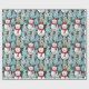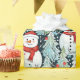 O plástico de Natal com homens de neve em lenços vermelhos quentes e um bonito fundo de pinheiro azul.