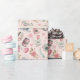 Este papel de embrulho apresenta um padrão de câmera vintage em um fundo cor-de-rosa pincelado.