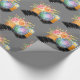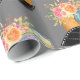 Papel de embrulho com uma ilustração de aquarela de uma câmera laranja com um buquê de flores e uma tira de filme ondulada preta e branca.