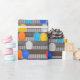 Este papel de embrulho tem um padrão de capacetes de trabalhadores da construção. Muitos capacetes diferentes pendurados numa parede metálica ondulada, tal como num local de trabalho. Você pode fazer este padrão neste papel de embrulho maior ou menor. Isto faz um ótimo embrulho para ambiente de trabalho ou embrulho para presentes promocionais de empresas de construção.