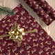 Cardeais vermelhos são dentro, os chifres postes de Natal dourados, que são decorados com uma variedade de verde, cones de pínus, folhas e bagas sagradas festivas. O fundo deste papel de embrulho é uma cor vermelha-escura.