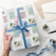 Papel de embrulho personalizado com selos de correio antigos em azul verde vermelho e bege decorado com um palco, cones de pínus, bagas de inverno e palavras festivas (Deixem-no nevar, Feliz Natal e, Joy Hope Peace Acredite no Natal). A modelo está configurada para personalizar um dos carimbos com seu nome e sinal de saída. Os selos de postagem sentam-se sobre um padrão geral de árvores de natal. Por favor, procure na minha loja designs semelhantes, com e sem fotos.