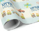 Papel embrulhando com um viagem e um design de transporte fofo para crianças. Projetado com ilustrações da arte infantil temática das crianças fofinhas de um pequeno cão andando em um avião e um trem de brinquedo cheio de bichos e um carro conversível guiado por um cachorrinho também. Um sol brilhante de rabisco laranja brilha por cima. Texto diz pouco explorador. Colocado sobre um fundo listrado de creme e azul. Seria muito bonito para um chá de fraldas ou aniversário de criança.