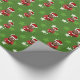 Design com uma ilustração de uma linda e sorridente menina negra feliz com cabelo curto, ela está vestindo fantasia de Papai Noel vermelho e branco e segurando um presente; Design de Natal com fundo verde sem costura com estrelas