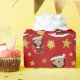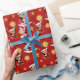 Papel de embrulho de Natal com uma ilustração de uma menina feliz sorridente e de cabelo preto longo, ela está vestindo fantasia de Papai Noel vermelho e branco e segurando um presente; com um modelo de texto editável para seu nome ou mensagem, design de feriados de Natal com um fundo vermelho sem soldadura com estrelas
