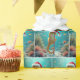 Cavalo-marinho vestindo um chapéu de Papai Noel se agarra a uma cana doce em uma cena submarina