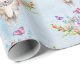 Papel de enrolamento com fundo pastel azul esbranquiçado. Camadas sobre o topo está um crânio bicho-papão com um buquê floral sobre a cabeça e pequenas borboletas se espalhando.