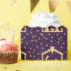 Uma silhueta da família santamente com o estábulo, de Joseph e de Mary que olham sobre o bebê Jesus no comedoiro. As estrelas Dourados e os redemoinhos cercam a cena. O fundo é uma cor roxa régia majestosa. Para personalizar com texto, clique sobre a personalização ele botão.