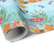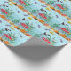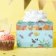 Este papel colorido de embrulho está cheio de vida, cheio de peixes incomuns e vida marinha, incluindo estrelas-vivas, peixe-espada, anêmonas-do-mar e um submarino vermelho brilhante.