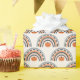 Papel de embrulho para o Halloween com uma versão de Halloween de um arco-íris com uma pequena abóbora, um arco de morcegos e uma paleta de cores de Halloween neutra em termos de gênero.