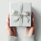 Este belo papel de embrulho apresenta um padrão verde e branco, listrado, neutro em termos de gênero.