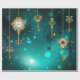 Chaves Douradas e antigas com engrenagens e marcadores penduram em correntes douradas sobre fundo verde luminoso.