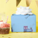 Um design bonitinho com pouca escolta treina em cores brilhantes com uma fumaça saindo do topo. Um fundo azul macio.