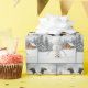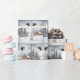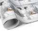 A whimsical snowman stands upside down with boots on its head as snow gently falls, revealing a cozy cabin in the snowy background