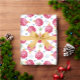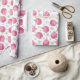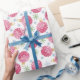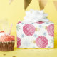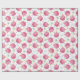Pink ornaments with blue and green snowflakes sprinkled across a bright white background.