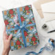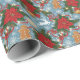 This charming Christmas wrapping paper features a delightful blue background adorned with vibrant red poinsettias, golden bells, leaping white reindeer, and cheerful gingerbread men. Accented with swirling red ribbons, glowing string lights, pine branches, and delicate snowflakes, it captures the joyful spirit of the holiday season in a classic, festive design.