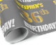 Este design de papel de embrulho apresenta uma mensagem como "STEPHEN'S 36th BIRTHDAY!", com o "36º" a ter uma aparência falsa/imitada de cor dourada, e com o nome e "BIRTHDAY" numa fonte divertida e ousada. O nome pode ser personalizado e o fundo é cinza colorida (cinza). Um papel de embrulho como este poderia talvez ser usado para embrulhar presentes de aniversário que são dados a alguém em comemoração de seus trinta e seis anos de aniversário. [~Z0000211]