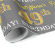 Este design de papel de embrulho apresenta uma mensagem como "First-Name’s 49th BIRTHDAY!", com o "49º" a ter uma aparência falsa/de cor dourada. O nome pode ser personalizado e o fundo é cinza colorida (cinza). Talvez possa ser utilizado quando se dá presentes para o quadragésimo nono aniversário de alguém. [~Z0000185]