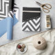 Padrão elegante, na moda e sofisticado de zigue-zague (chevron) em cinzas e cor branca com manchas azuis e pretas de cor. Presente moderno e moderno, perfeito para o amante ziguezague na sua vida.