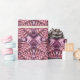 Este papel de embrulho impressionante apresenta um padrão repetitivo de uma intrincada mandala de abstrato, constituída por pequenas dobras de tecido de cetim em tons luminosos de vinho, roxo e rosa.