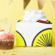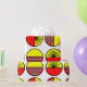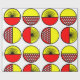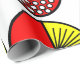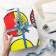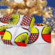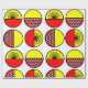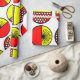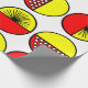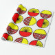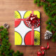 Este papel de embrulho tem uma design moderna do século médio de meio-círculos, alguns com estrelas, alguns com pequenos círculos, e alguns apenas sólidos, em vermelho e amarelo.