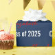 As folhas de papel embrulho são azuis. Todos têm um padrão de texto para o nome do formando e Classe de 2025. O nome (Mostra: Elizabeth) aparece num guião vermelho elegante. O outro texto é branco. Todo o texto pode ser editado.