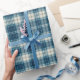 Elegant and traditional wrapping paper featuring a seamless plaid pattern in deep indigo blue and creamy beige. The design uses intersecting lines of varying thickness to create a timeless tartan aesthetic, perfect for holiday gifts, birthdays, or any occasion that calls for a cozy, heritage, or rustic presentation. This paper provides a sophisticated, non-seasonal look suitable for both men's and women's gifts.
