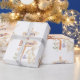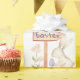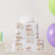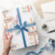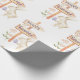 Este papel de embrulho de presente personalizado apresenta um tema de Páscoa giro sobre um fundo branco. A imagem mostra um pequeno coelho branco esgueirando-se com um ovo decorado. Atrás do coelho está um cartaz de madeira que diz "Felz pascoa" com setas apontando na direção de onde vem o coelho. Um pássaro pequeno está empoleirado na placa.
