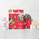 Torne seus presentes de férias especiais com papel personalizado de empacotamento de fotos. Este elegante design apresenta ilustrações ao estilo de vintage inspiradas pela opulência da era Art Deco. Inclui renas saltitantes, árvores festivas de Natal e estrelas, em conjunto com na moda retro tipografia. Personalize o modelo com três fotos favoritas e o nome do destinatário ou o sobrenome da sua família. Um design único que combina o estilo do eterno com uma reviravolta moderna! Este pacote de presentes de padrão uniforme está disponível com um acabamento mate ou brilhante. Cores impressas: vermelho, branco e dourado.