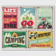 Coleção de sinais retrorreflectores de caminhada e acampamento. Posters vintage de atividades ao ar livre. Ilustração de natureza selvagem e aventuras.